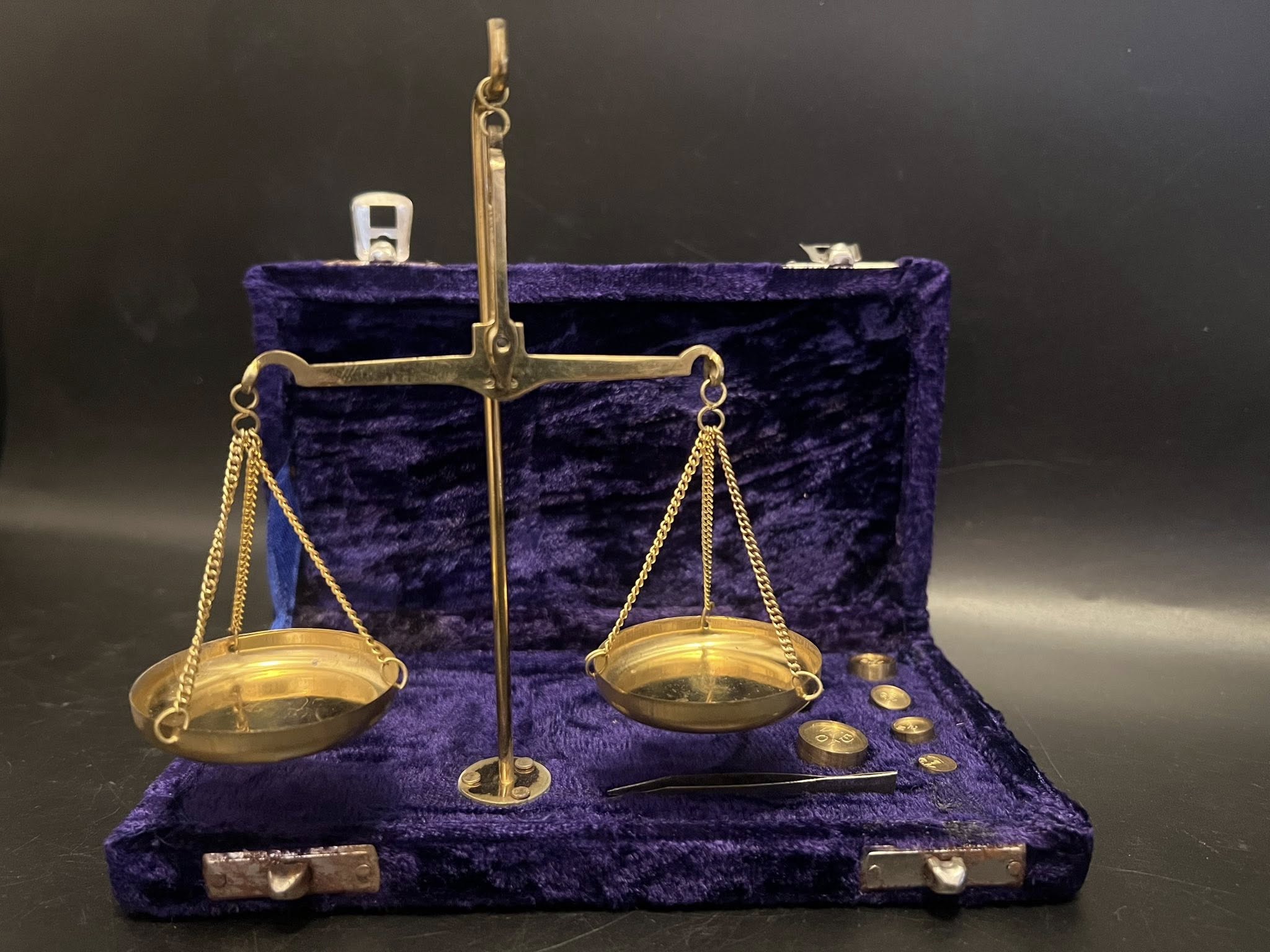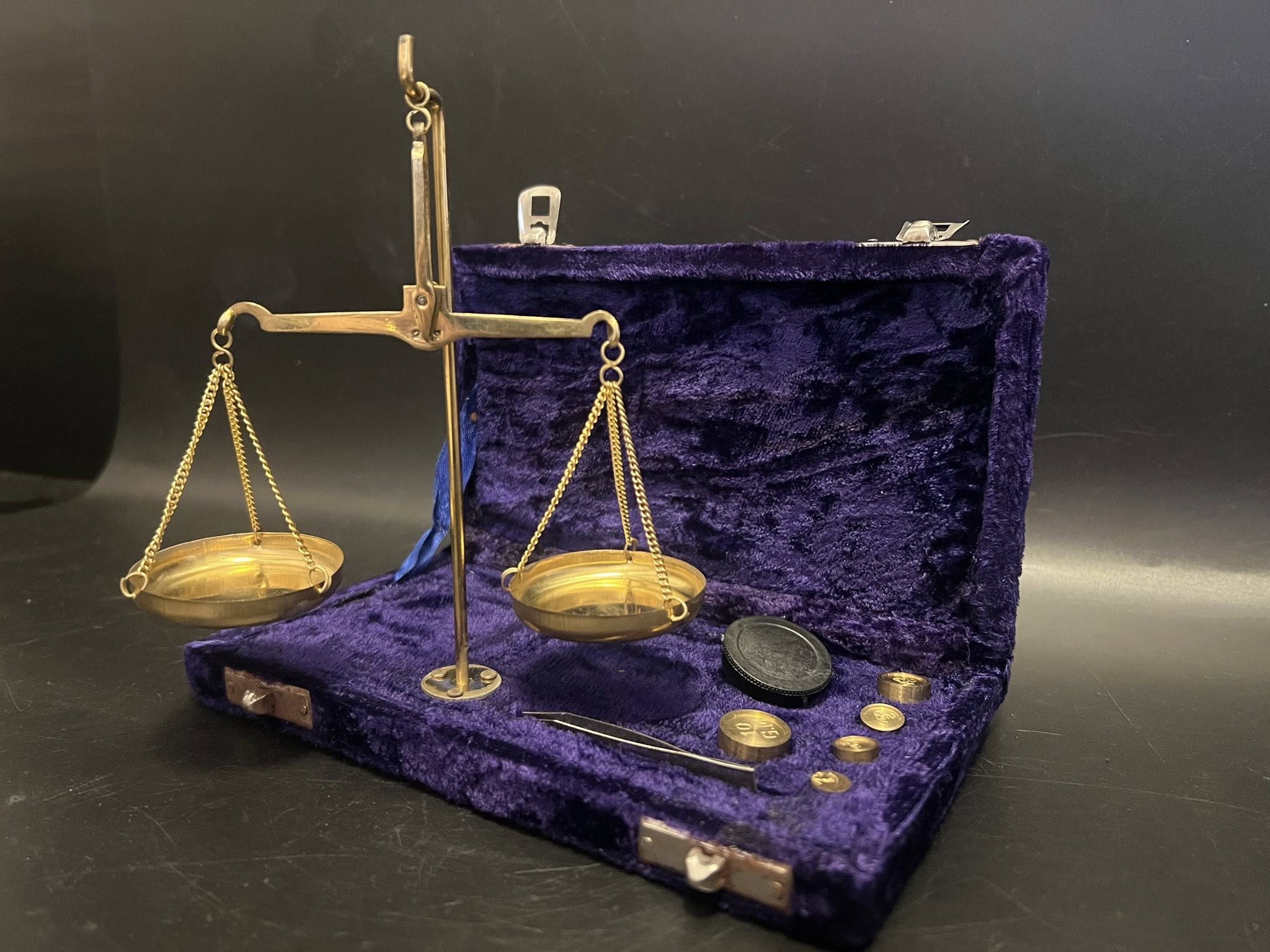 Balanță pentru metale pretioase prevazută cu o cutie de catifea.
