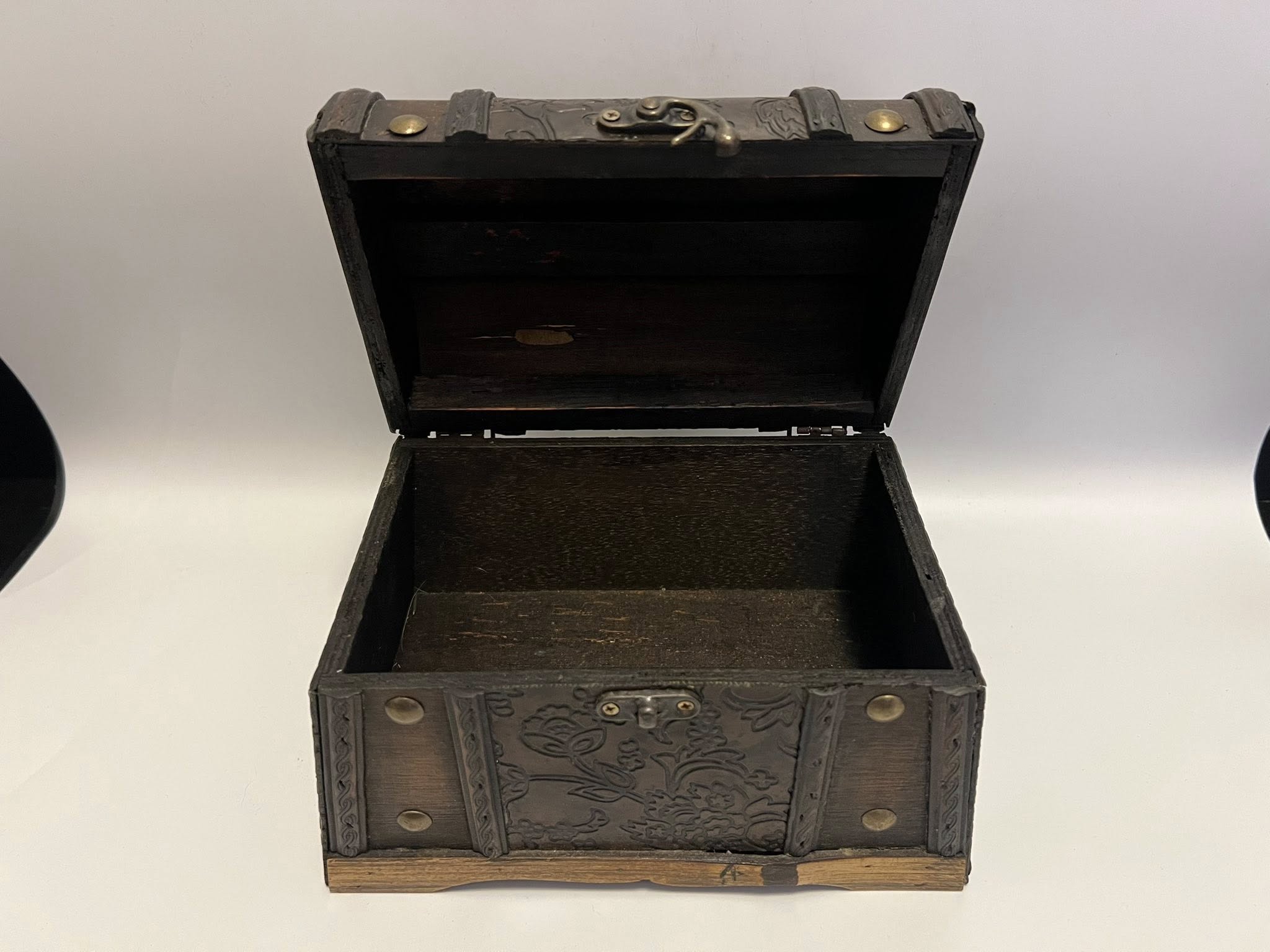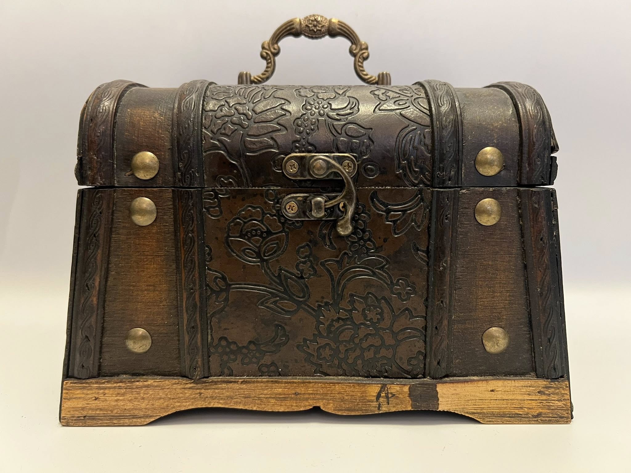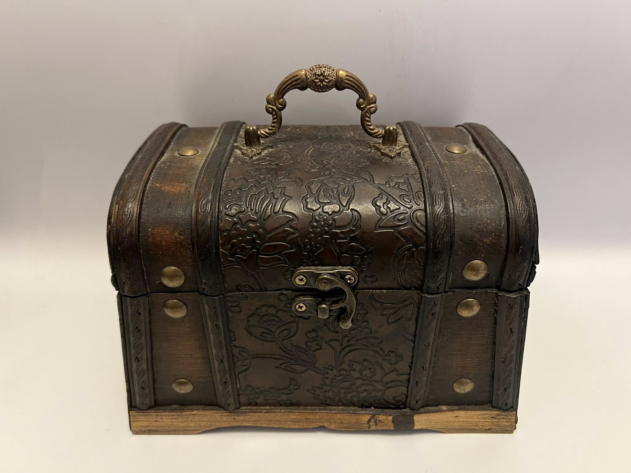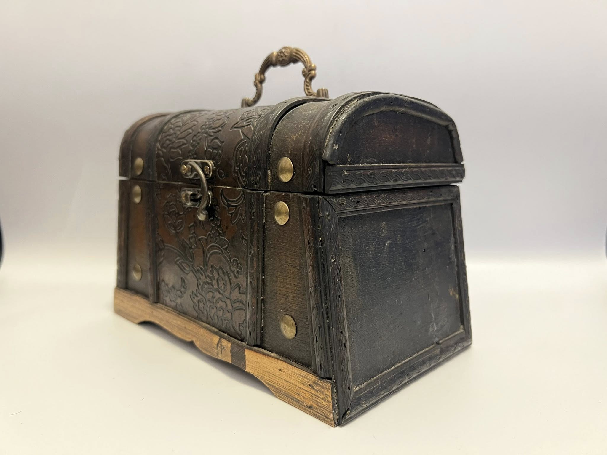 Cufar vintage realizat din lemn si ornamente de metal.