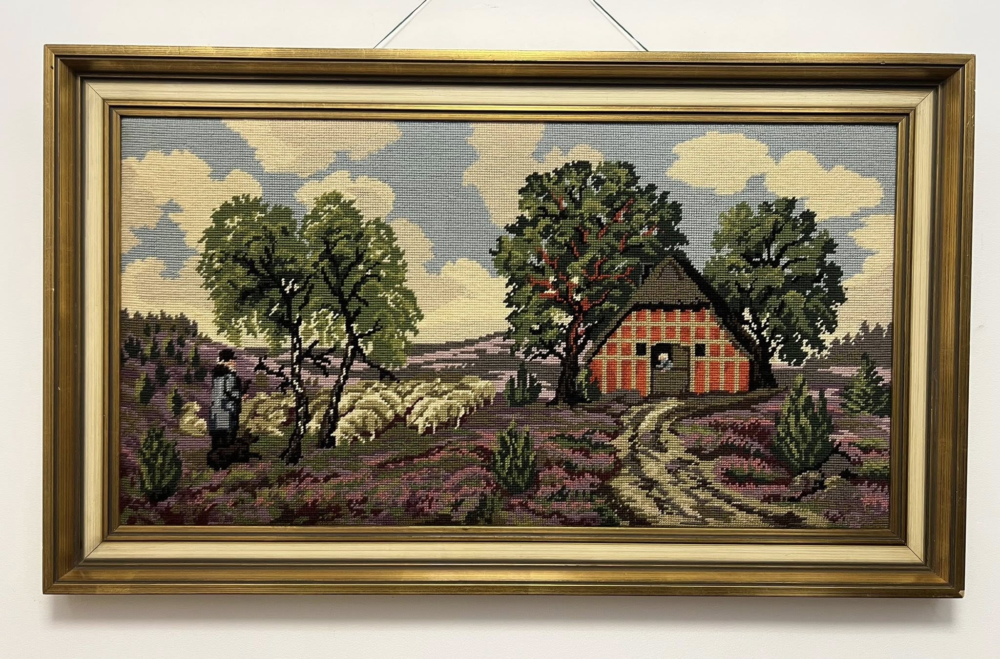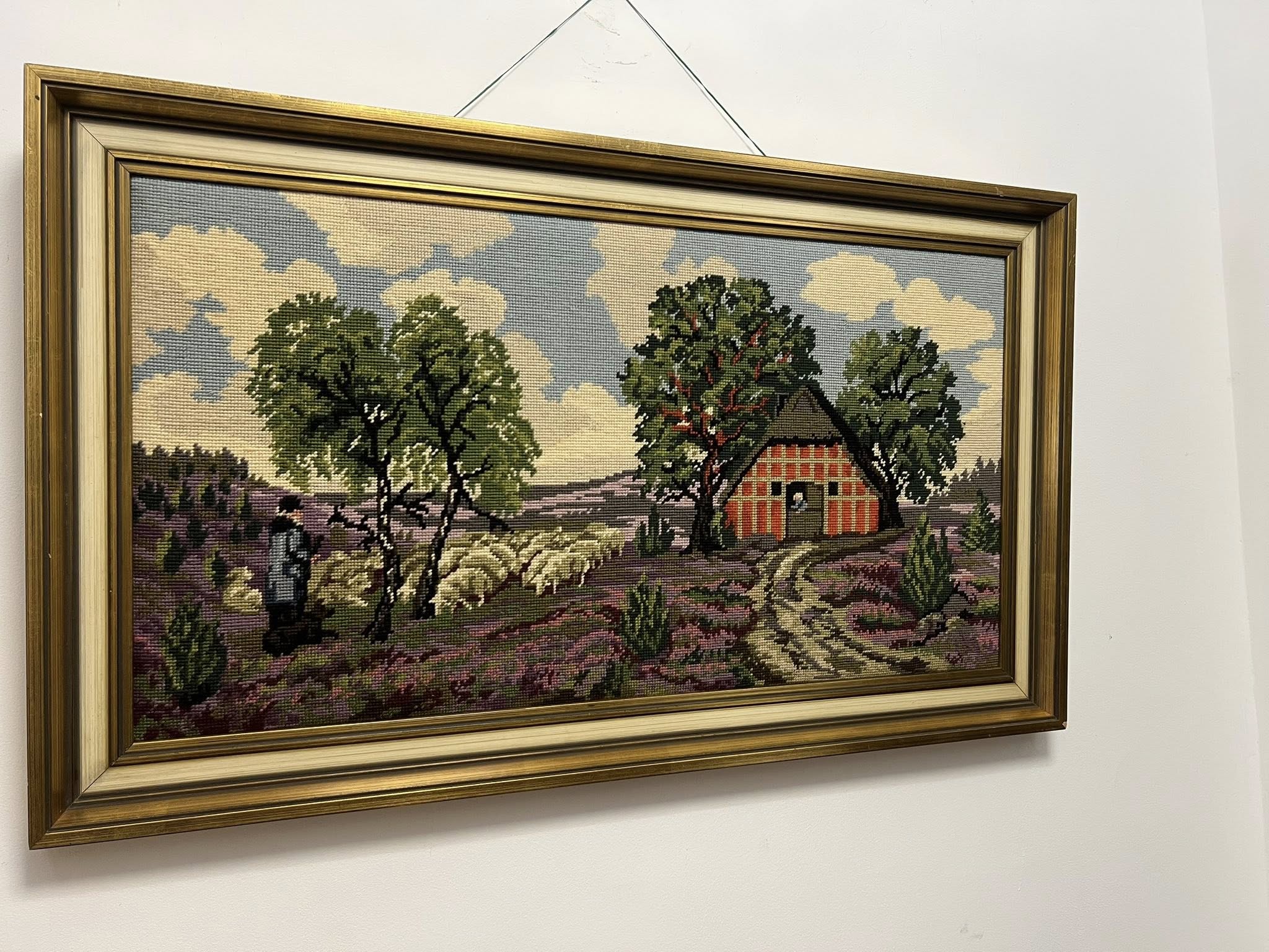 Goblen fermecător, ce surprinde un peisaj rural idilic, unde natura și viața de la țară se împletesc armonios.